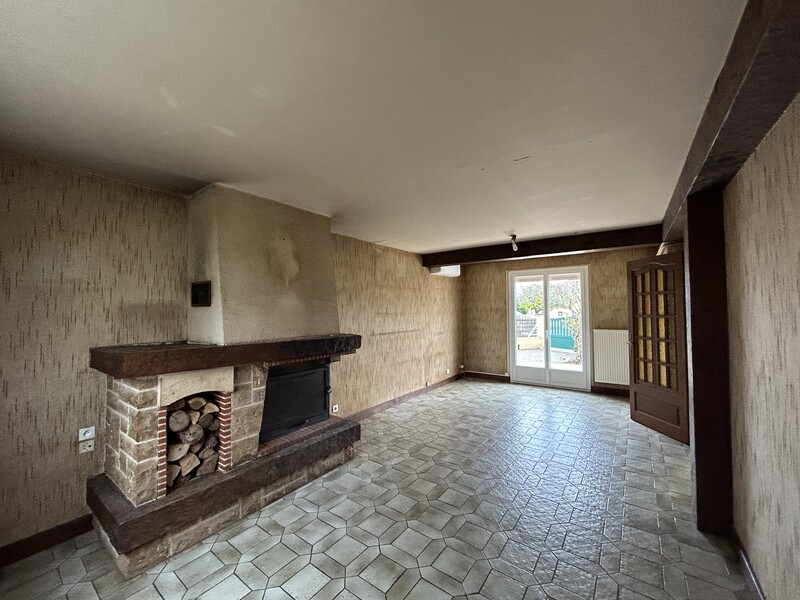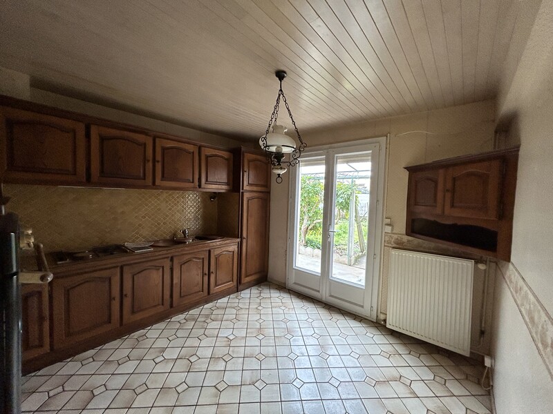 Maison dans quartier résidentiel, mitoyenne sur une face par le garage (avec le garage du voisin), composée en rez-de-chaussée d'un hall d'entrée, une cuisine meublée (bois), un séjour avec cheminée insert et climatisation réversible, un WC, un espace chaufferie (chaudière fioul avec possibilité de se raccorder au chauffage collectif de la commune, installation en place).