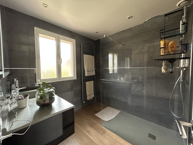 Dans une impasse, dans un quartier résidentiel très calme, cette maison contemporaine est en excellent état général. Elle se compose d'une cuisine meublée équipée et séparée de belle facture, un séjour d'environ 34 m² avec baies vitrées ouvertes sur terrasse couverte et sur la terrasse de la piscine. Un dressing, trois chambres (18, 15 et 11 m²) chacune avec placards (dont une chambre double ; dressing ou salle de jeux d'environ 15 m²). Deux salles d'eau entièrement refaites de belle composition.